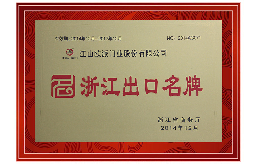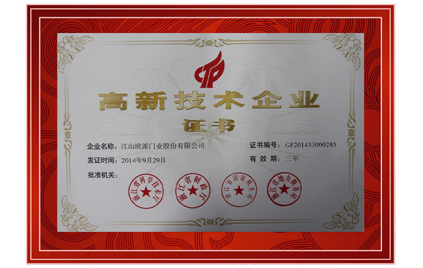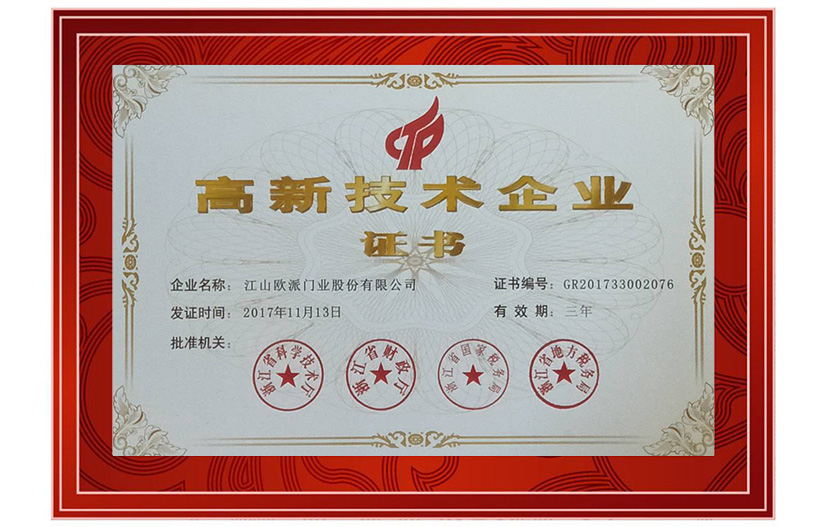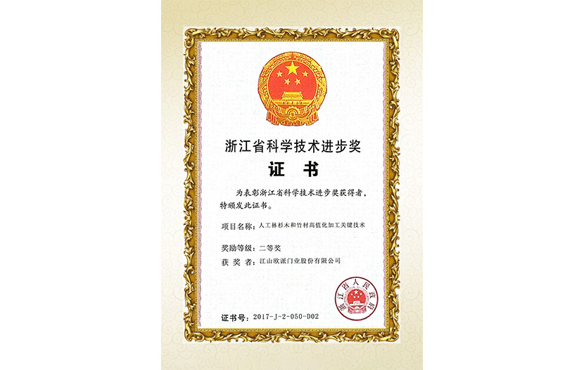 浙江省科学技术进步奖证书-江山欧派门业股份有限公司